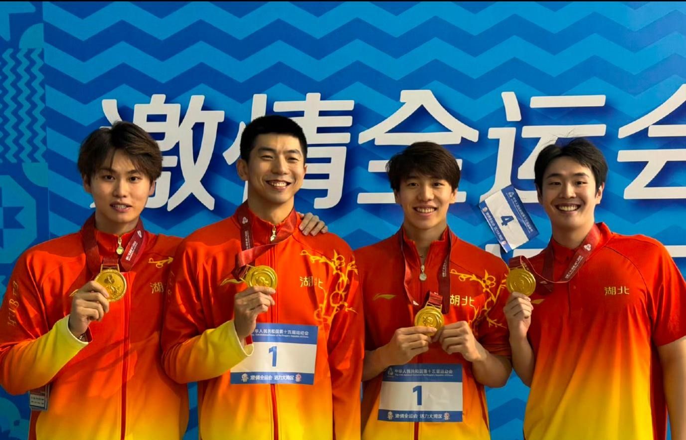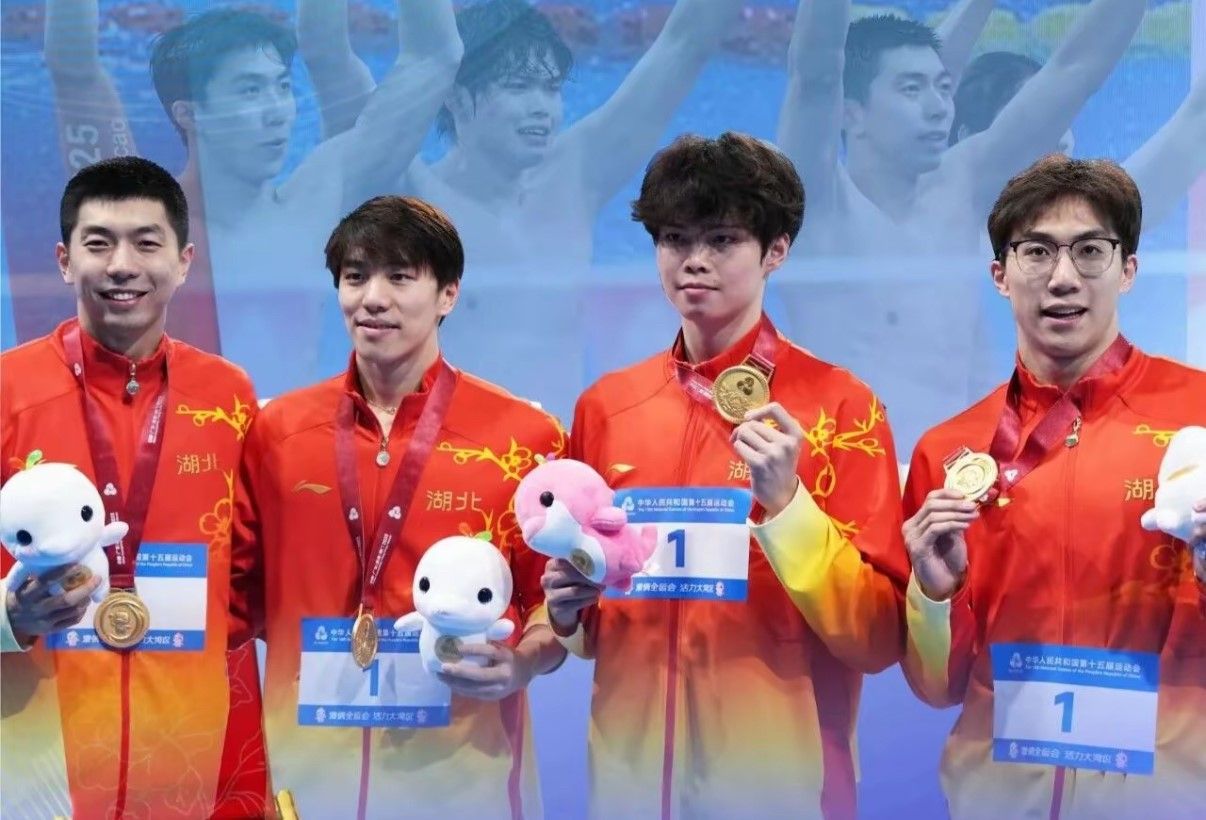 游泳赛场中,浪花翻涌间上演着速度与力量的较量。来自黄色直播 2023级研究生孙佳俊代表湖北队在 50 米蛙泳项目和男女 4×100 米混合泳接力项目中,从预赛到复赛再到决赛,他顶住巨大的竞技压力,凭借着扎实的技术功底和关键时刻的稳定发挥,帮助湖北队取得两枚铜牌。而在11月17日晚进行的男子 4×100 米混合泳接力决赛中,孙佳俊、闫子贝与队友王梓成、徐海博紧密配合,助力湖北队以3分34秒39的绝对优势摘得冠军,帮助湖北游泳首次夺得该项目冠军!