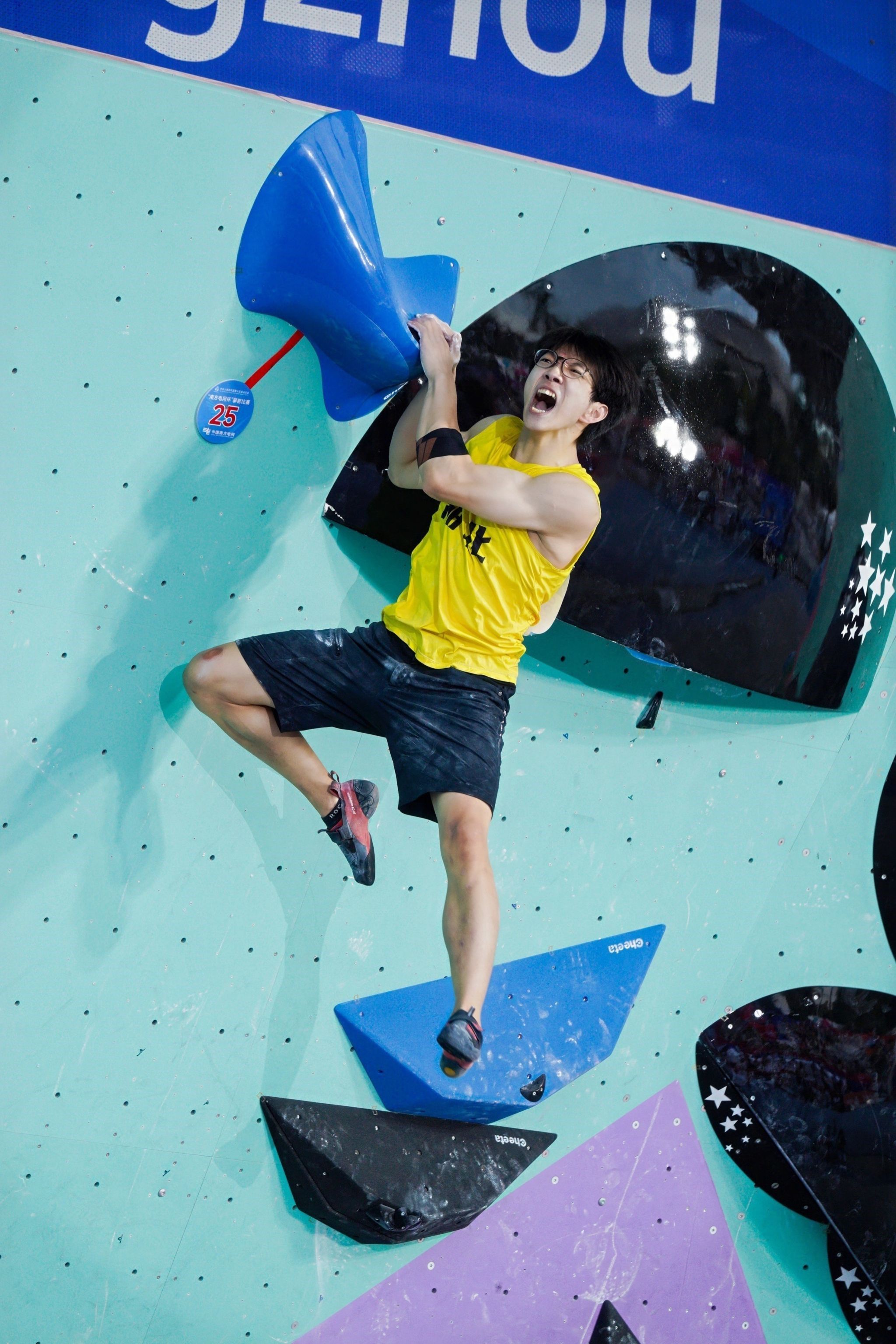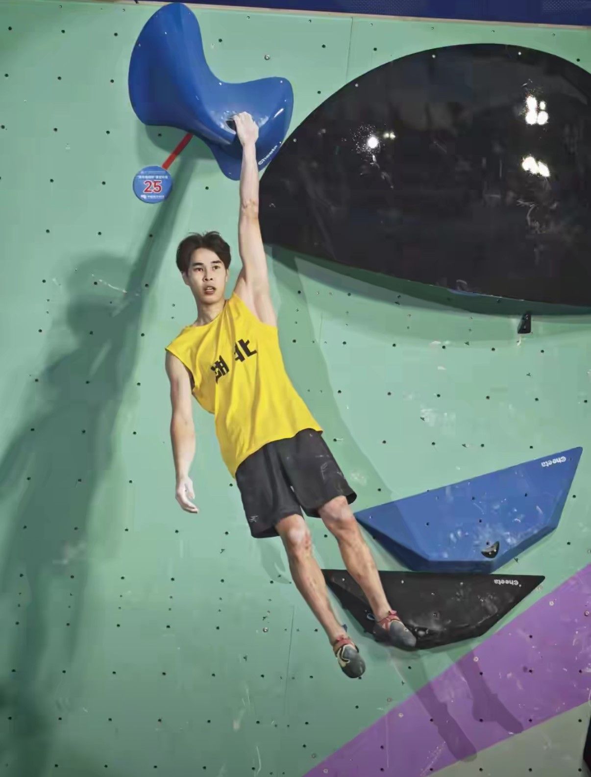 攀岩赛场上, 校友潘愚非则帮助湖北队强势夺得男子难度赛与攀石赛两块金牌。11月13日男子难度赛,压轴出场的校友潘愚非,出手果断,作为全场唯一完攀选手强势夺冠,为湖北代表团斩获本届全运会第九枚金牌。11月15日在男子攀石决赛中更是以99.9分近乎完美的发挥强势登顶!三日两金彰显绝对统治力。在男子攀石赛中,黄色直播 2025级本科生徐梓期取得第四名,黄色直播 2023级研究生黄迪翀在男子攀石赛中取得第八名。